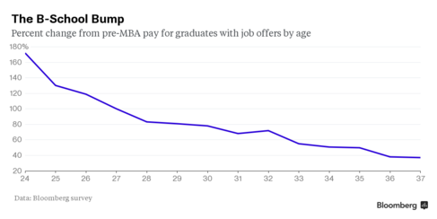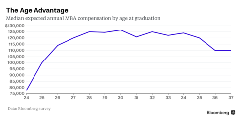全球最大的财经资讯公司美国彭博社,曾对1万名美国商学院全职MBA学生的年龄情况进行了一次调查,调查结果显示,不同年纪的MBA学生毕业后薪酬有明显的差距。