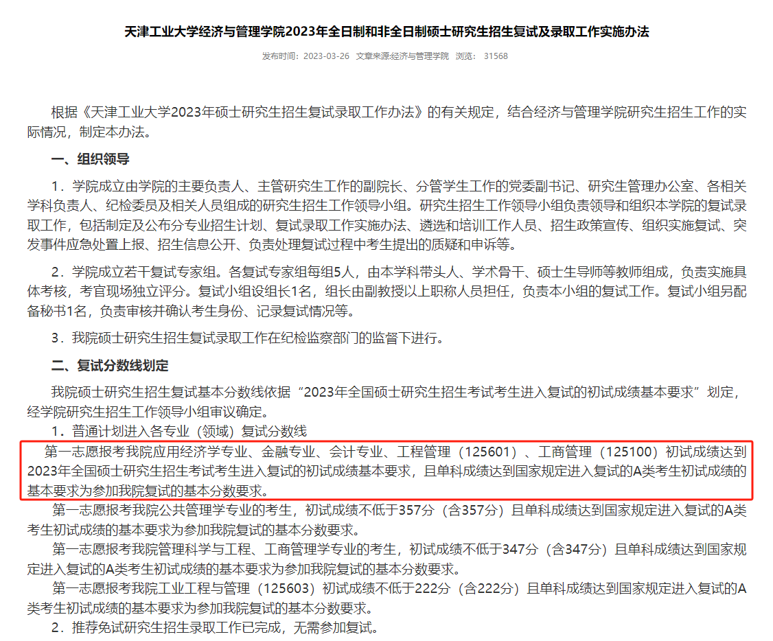 天津工业大学2023年硕士研究生招生考试考生进入复试的初试成绩基本要求已公布!2023年MBA复试分数线:167/41/82。