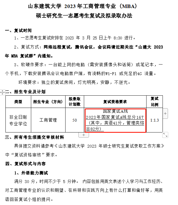 山东建筑大学2023年MBA复试分数线