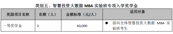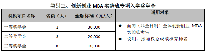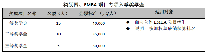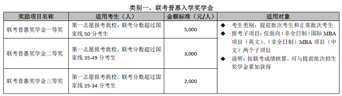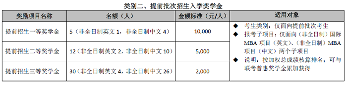 设立五种类别入学奖学金,以资鼓励报考我校MBA/EMBA项目、全国联考初试分数成绩优秀、提前批次招生面试表现出色的考生。
