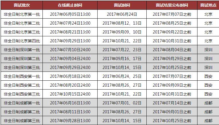 2018年非全日制MBA北京项目、深圳项目、西安项目、成都项目共设有13个申请批次,申请人按规定时间进行在线提交材料;对申请人的材料进行评审后,定期组织面试。