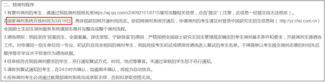 注意:招生单位接收所有调剂考生(既包括接收外单位调剂考生,也包括接收本单位内部调剂考生)必须通过教育部指定的“全国硕士生招生调剂服务系统”进行。未通过该系统调剂录取的考生一律无效(各加分项目考生、享受少数民族政策考生可除外)。