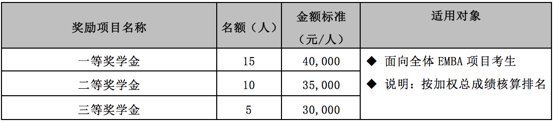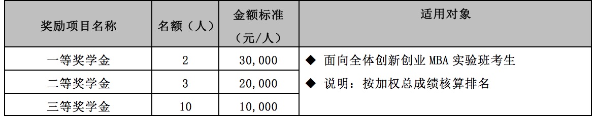 设立四种类别入学奖学金,以资鼓励报考我校MBA/EMBA项目、全国研究生考试初试分数成绩优秀、提前批次招生面试表现出色的考生。